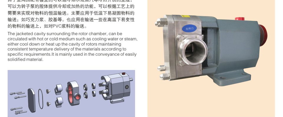 ZB3A系列膠體泵-又稱羅茨泵、不銹鋼轉子泵、凸輪泵、萬用輸送泵、酵母泵、蝴蝶泵、三葉泵、鞋底泵、藥料泵、熱溶膠體泵、顆粒膠體泵、渣料泵、蛋白渣泵、高濃漿泵等,依靠兩個同步反轉動的轉子在旋轉過程中于進口處產生吸力(真空度),從而吸入所要輸送的物料。